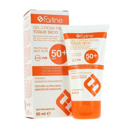 La protección solar FARLINE GEL-CREMA FACIAL TOQUE SECO SPF50+ adopta la forma de un gel-crema, ideal para aquellas personas que buscan un acabado seco y de rápida absorción. Es perfecto para quienes tienen piel grasa, ya que su textura ligera y sus micro-partículas absorbentes proporcionan un acabado mate y evitan la aparición de brillos. No deja sensación grasa ni pegajosa.